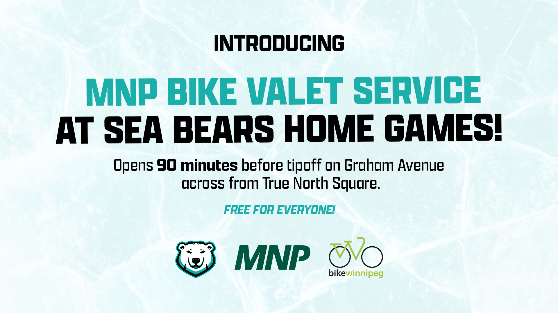 Winnipeg April 13, 2026 — The Winnipeg Sea Bears today announce a new bike valet service at home games in partnership with MNP and Bike Winnipeg, offering fans a safe, convenient and eco-friendly way to attend games. The MNP Bike Valet will be located on Graham Avenue across from True North Square and will accommodate both human-powered and electric-assisted bicycles. The service will be free for all fans, and provides a simple, hassle-free experience. “We’re excited to help make game days more accessible and sustainable for fans,” said Aaron Newnham, Senior Marketing Manager at MNP. “Partnering with the Winnipeg Sea Bears and Bike Winnipeg is a meaningful way for us to support the community while encouraging environmentally friendly transportation options." The program will be available 90 minutes before tip off and operate much like a coat check for bicycles: fans will hand over their bikes to an attendant and receive a claim stub. After the event, they will present the stub to have their bike returned. This secure, attended service is designed to make game-day travel easier while encouraging sustainable transportation. “Bike Winnipeg is thrilled to partner with the Sea Bears and MNP to provide safe and secure bike valet parking for all fans attending games this season,” said Mark Cohoe, Executive Director of Bike Winnipeg. “We’re also looking forward to organizing guided group rides from the northwest, northeast, southeast, southwest and central areas of the city to highlight safe routes to Canada Life Centre. We believe this will encourage people to skip traffic tie-ups, enjoy both the journey and the destination, and get more people biking more often.” The MNP Bike Valet program aims to create a welcoming and accessible experience for fans of all ages. By providing a secure location for bicycles, the Sea Bears, MNP and Bike Winnipeg are helping remove barriers for fans while supporting environmentally friendly travel and strengthening community connections. Skip the traffic, park your bike for free, and be part of the action this summer with single game tickets.
