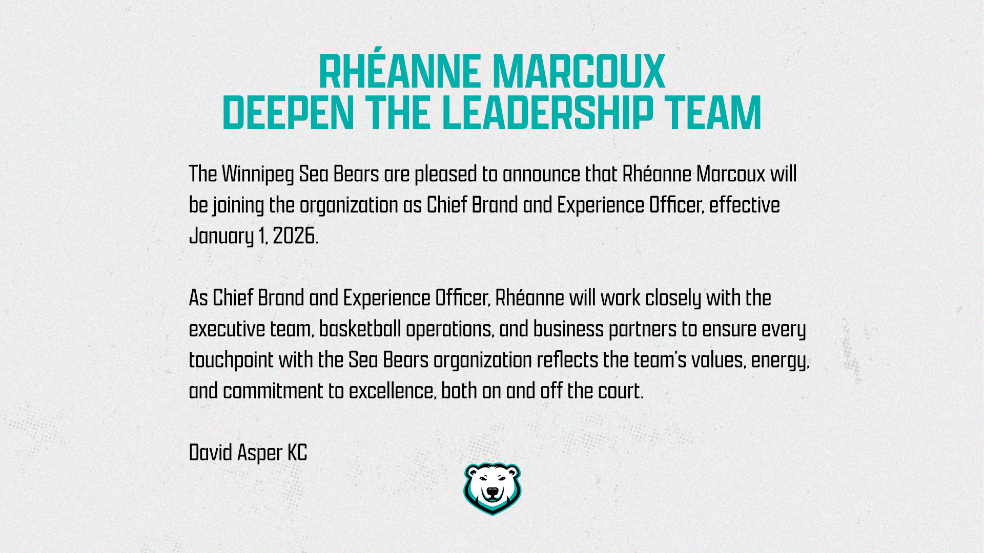 Winnipeg, MB – November 26, 2025 - The Winnipeg Sea Bears are pleased to announce that Rhéanne Marcoux will be joining the organization as Chief Brand and Experience Officer , effective January 1, 2026 . An alum of Red River College and the University of Winnipeg, Rhéanne has had a progressive and distinguished career in broadcast journalism, sports marketing and as an entrepreneur with her own creative agency. She’s worked with Radio Canada, True North Sports and Entertainment and has spent the past 11 years with the Winnipeg Blue Bombers, most recently as Vice President Marketing and Communications for the 112 th Grey Cup. In this newly created executive role, Rhéanne will be responsible for leading the Sea Bears’ overall brand strategy, fan and guest experience, marketing, and community engagement. She will oversee the development of integrated campaigns, in-venue and digital experiences, and partnerships that deepen the connection between the Sea Bears and fans across Manitoba and beyond. “Rhéanne brings a rare combination of strategic brand insight and a deep understanding of what makes live sports unforgettable,” said David Asper, Chair and CEO of the Winnipeg Sea Bears. “As we continue to grow our fan base and our impact in the community, her leadership will be critical in shaping how people experience Sea Bears basketball – not just on game day, but every day of the year.” As Chief Brand and Experience Officer, Rhéanne will work closely with the executive team, basketball operations, and business partners to ensure every touchpoint with the Sea Bears organization reflects the team’s values, energy, and commitment to excellence, both on and off the court. “Stepping into this role feels incredibly meaningful. The Sea Bears have ignited something special in our city, and I’m grateful for the opportunity to help shape the next chapter of that story,” said Rhéanne. “Winnipeg fans bring a level of passion and pride that is truly unmatched, and I’m looking forward to building on experiences that honour that spirit.” Rhéanne will be completing her current duties with the Winnipeg Blue Bombers and will assume her new role with the Winnipeg Sea Bears on January 1, 2026 .  ### About the Winnipeg Sea Bears The Winnipeg Sea Bears joined the Canadian Elite Basketball League (CEBL) as an expansion franchise in 2023. The city's only professional basketball team plays out of Canada Life Centre from May to August in a 24-game regular season schedule. Winnipeg businessman and lawyer, David Asper, is the organization's owner and chairman. More information on the Sea Bears can be found at seabears.ca and @wpgseabears on Instagram , X , TikTok , LinkedIn & Facebook . About the CEBL A league created by Canadians for Canadians with a mission to develop Canadian players, coaches, sports executives, and referees, the CEBL boasts the highest percentage of Canadian players of any pro league in the country with 75% of its rosters being Canadian and a record 12 players with NBA experience in 2024. Players also bring experience from the NBA G League, top international pro leagues, the Canadian National team program, NCAA programs, as well as U SPORTS and CCAA. More than 20 players have signed NBA contracts following a CEBL season, and numerous CEBL players attend NBA G League training camps every year. The CEBL season runs from May through August with games broadcast live on CEBL+ , TSN, TSN+, RDS, Game+ and Next Level Sports & Entertainment. More information about the CEBL is available at CEBL.ca and @cebleague on Instagram , Twitter , TikTok , LinkedIn , Facebook & YouTube .