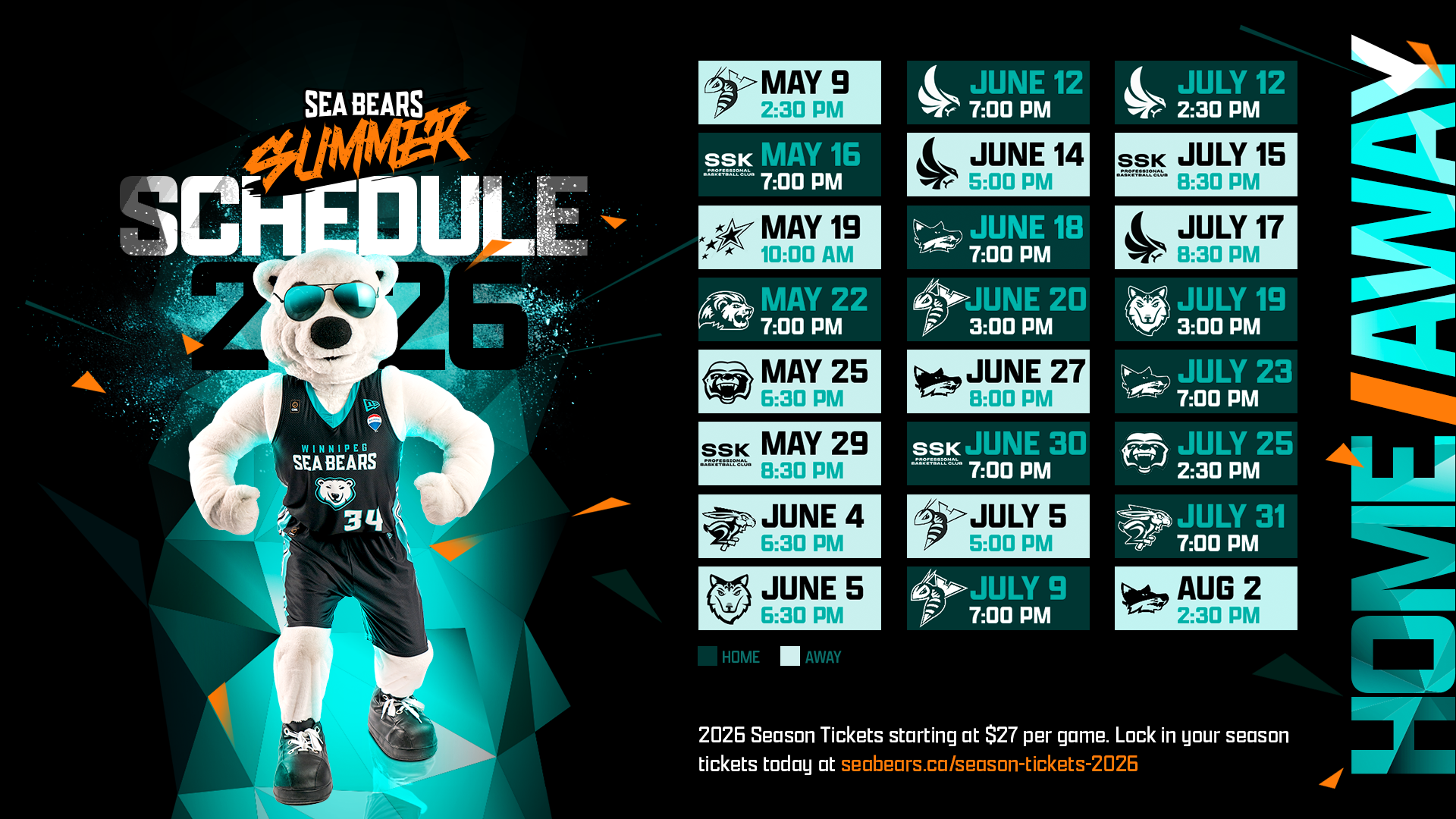 With a mix of weekend matinees, prime-time weekday tips, and rivalry matchups, the 2026 home schedule is built to make Sea Bears basketball a centerpiece of summer in Winnipeg.